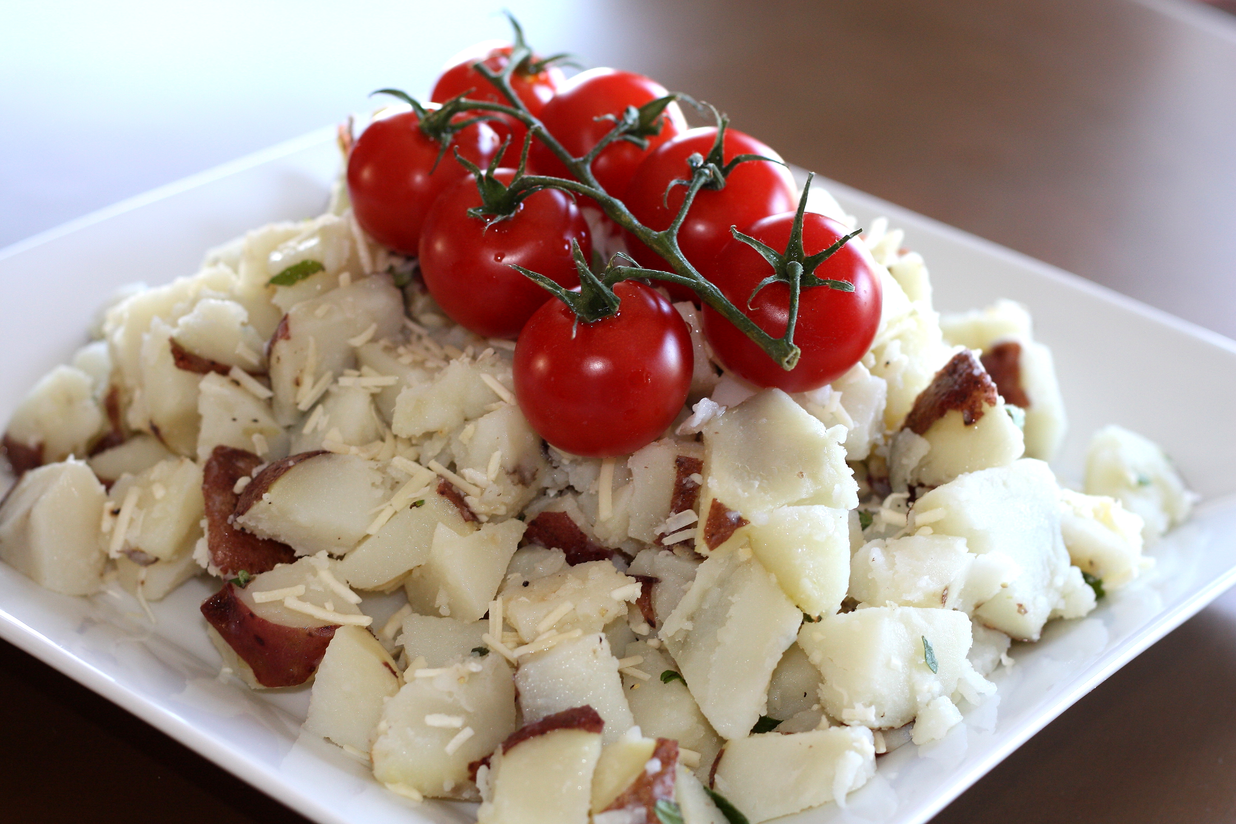 Combine the olive oil, lemon juice, Parmesan cheese and garlic. Add in fresh or dried herbs to taste along with the salt and pepper. Mix the dressing well and fold in to the diced potatoes. Top with tomatoes and serve warm or chilled. I like to make this when my herb garden is in full swing.