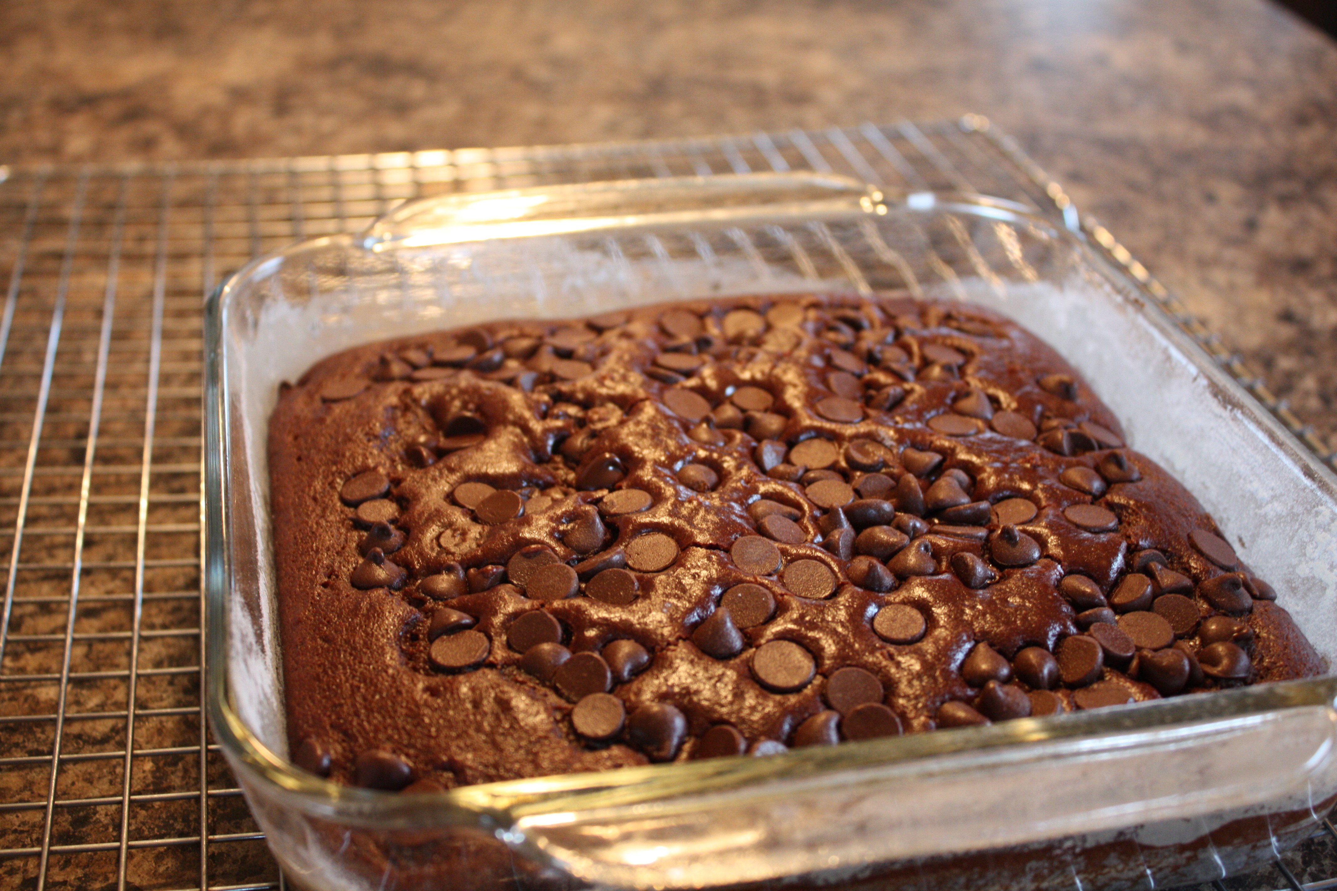 Mix until lumps are gone. Pour into a greased and floured 8 by 8 pan. Sprinkle with 1/4 cup chocolate chips. (You can lightly flour the choc chips to help prevent them from sinking.)