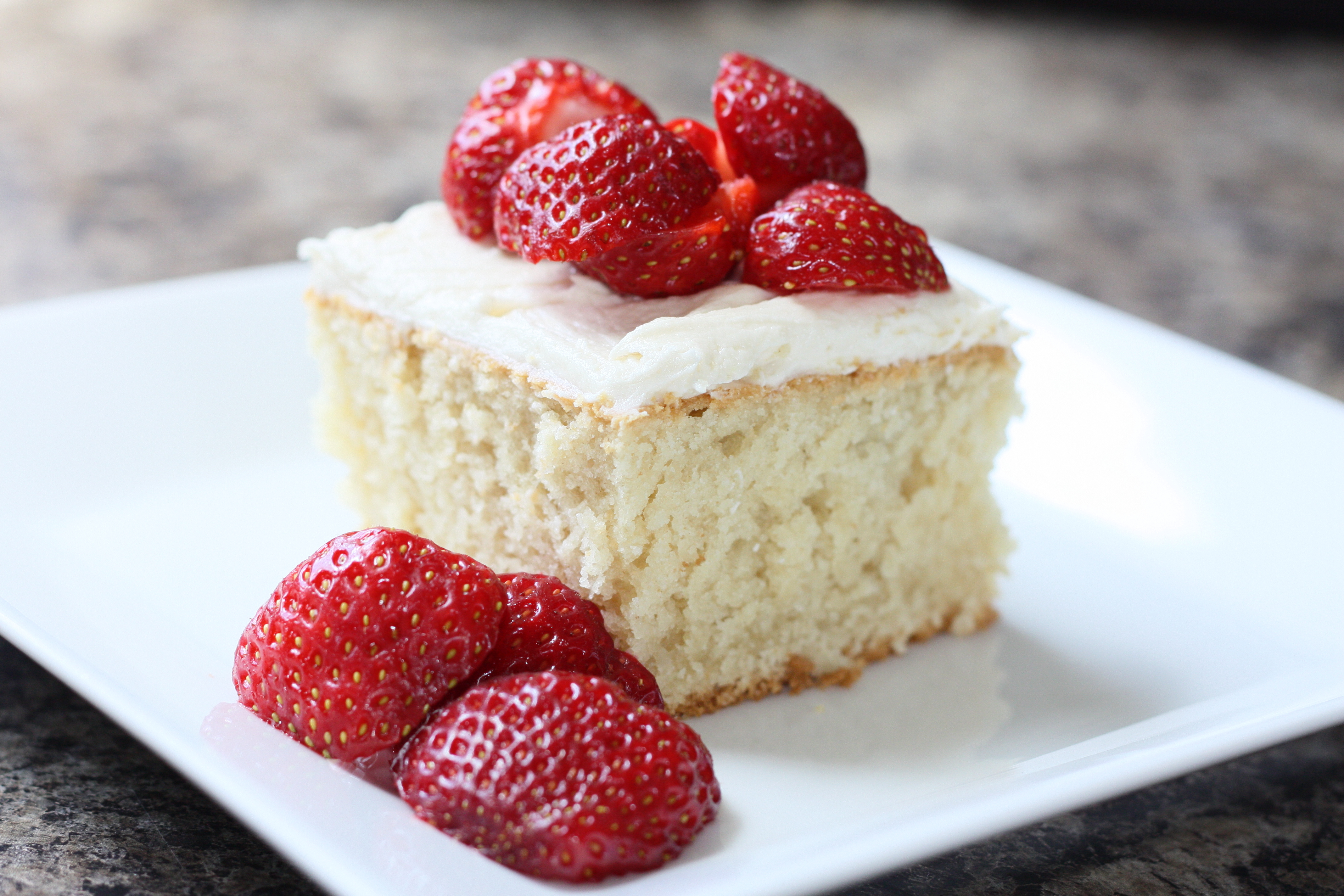 I wanted another white cake recipe to have with fresh berries but this time I wanted to use real butter. This can be difficult when making a white cake as the butter tends to make things crumbly. So, I added in some cream cheese to help keep the cake together and the flavor of course goes well with berries.