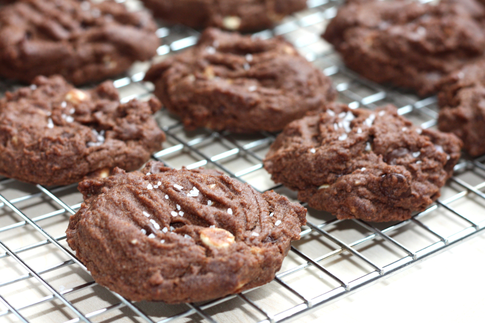 These triple chocolate cookies will satisfy any chocolate cravings! The 3 kinds of chocolate come from the cocoa, semi-sweet chocolate chips, and white chocolate chips. A sprinkle of sea salt on the top enhances the chocolate flavour but is optional.
