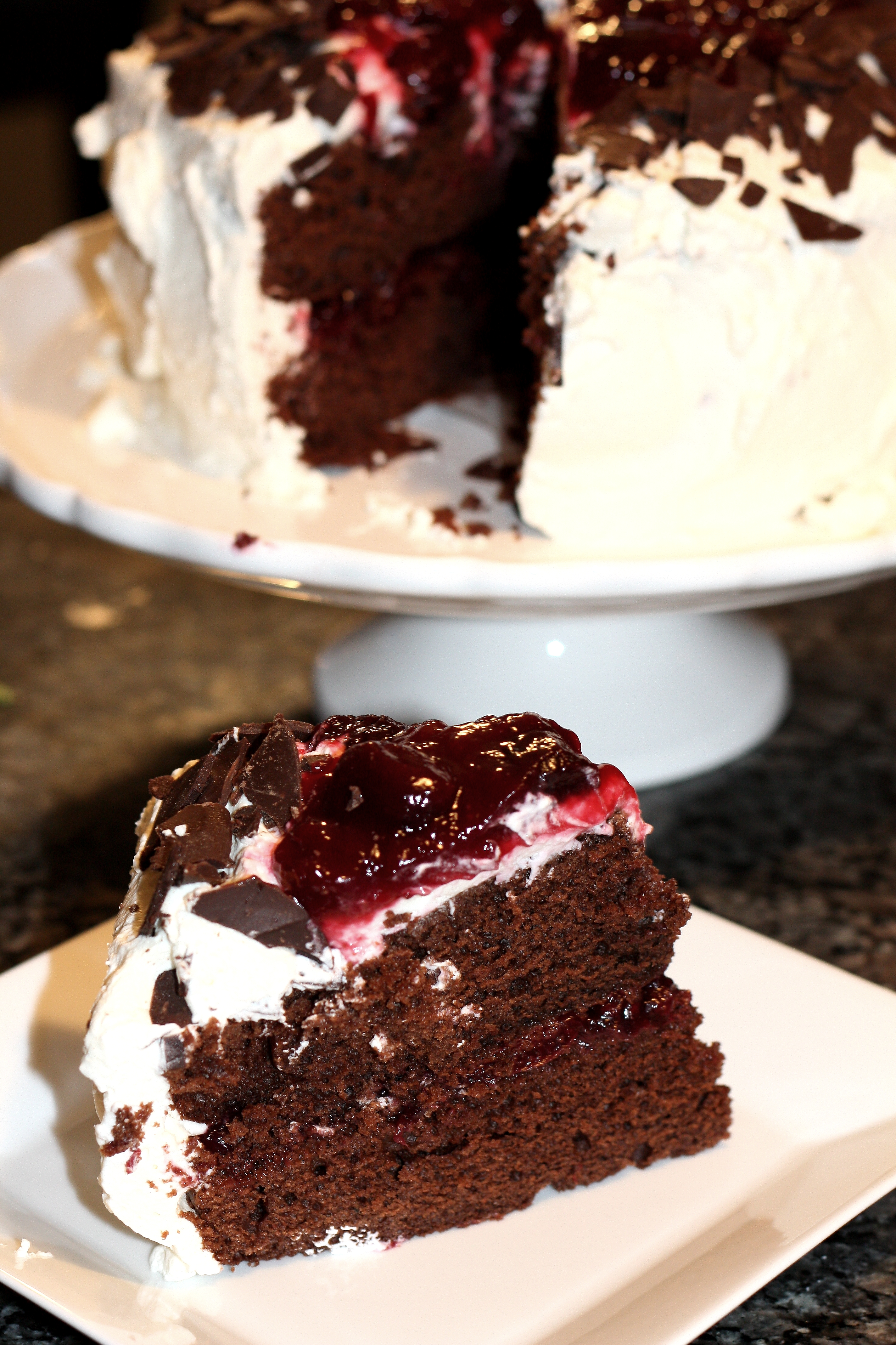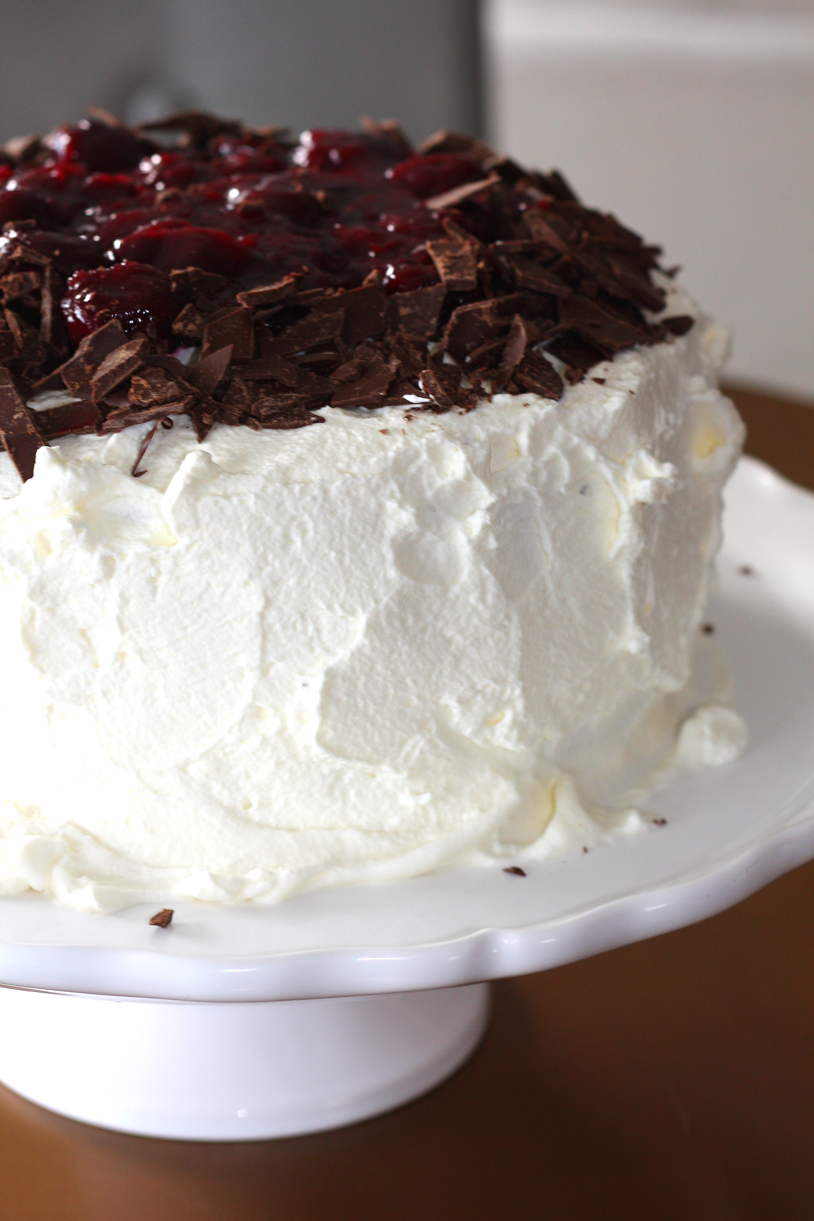 Assembling the Cake: For easy assembly, make the cake 2 layers (you can do 4 but you may need more cherry filling and then you are faced with cutting the cakes into two). Take one cake layer and top with 3/4 of the cherry mixture for the filling. Then place the second cake layer on top. Frost the entire cake with the whipped cream. Top the cake with the remaining cherries. Add shaved chocolate around the top edges of the cake.
