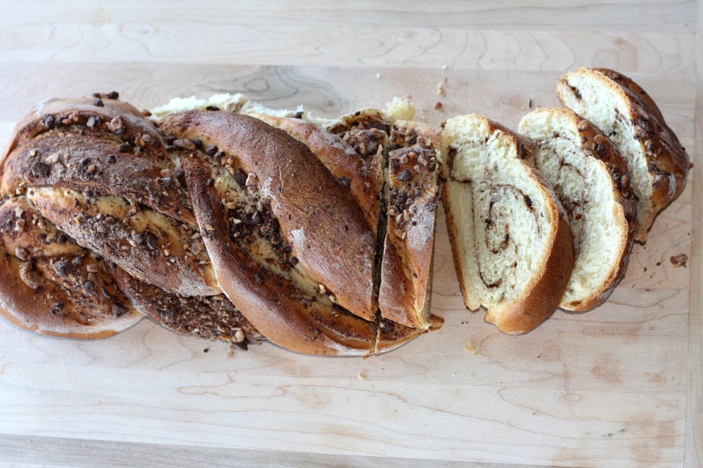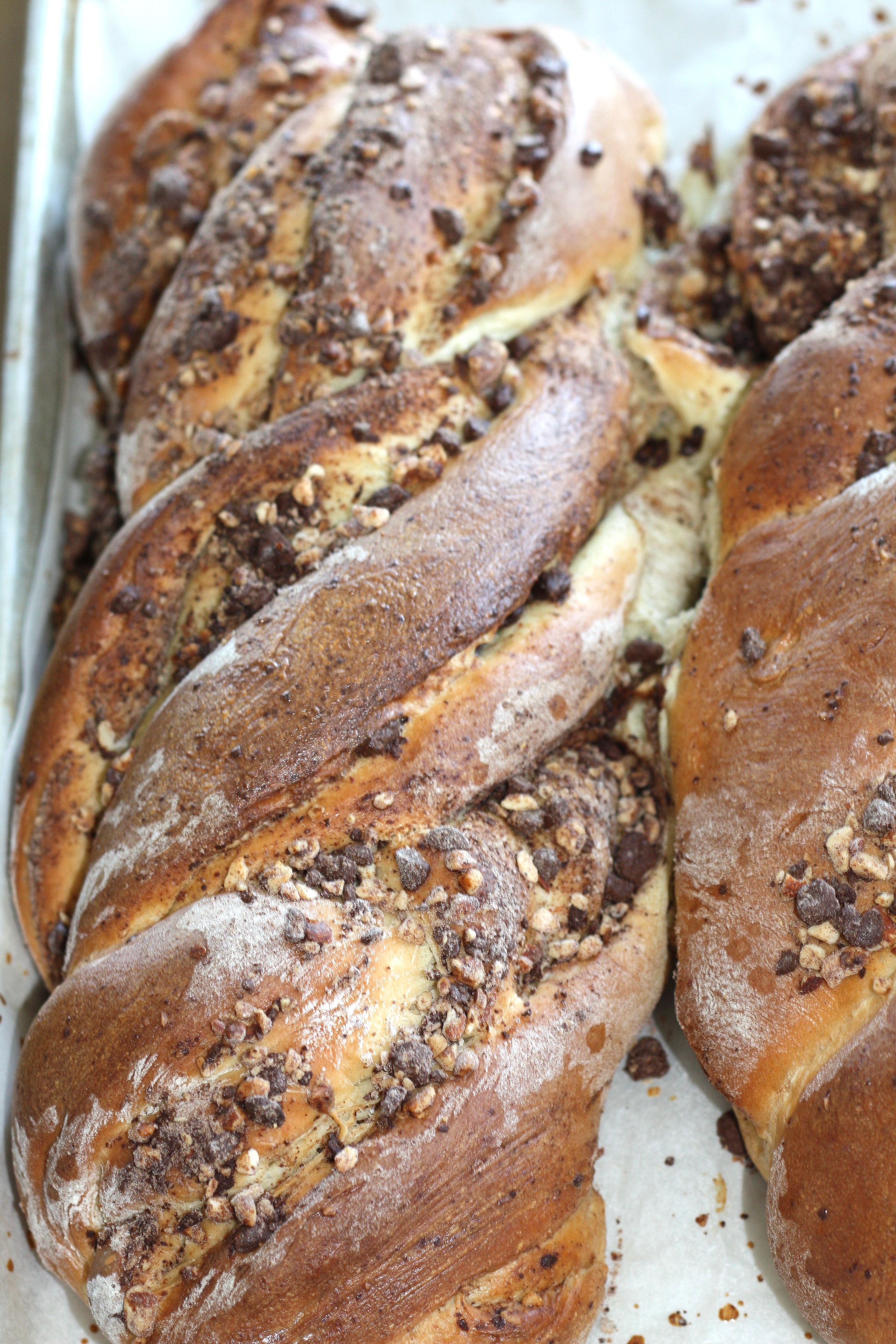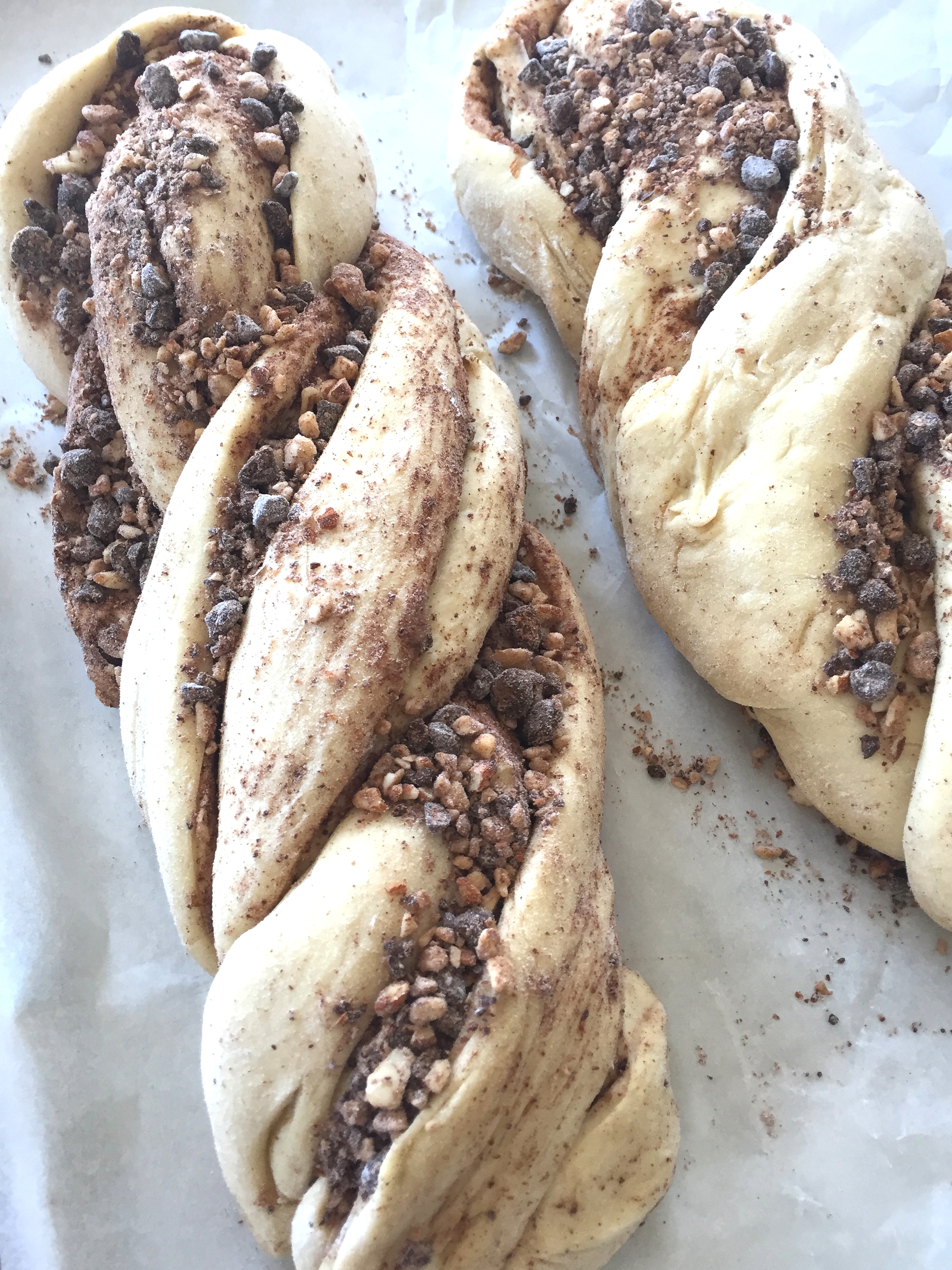 Divide filling between the two pieces of rolled out dough and then roll up each separately. Cut each roll down the middle and twist the 2 pieces together. Some of the filling will fall out but you can just sprinkle it on top after you get it on the pan. I recommend rolling and twisting on the parchment paper you will bake on to make the transfer easier. You will end up with 2 double twisted loaves.