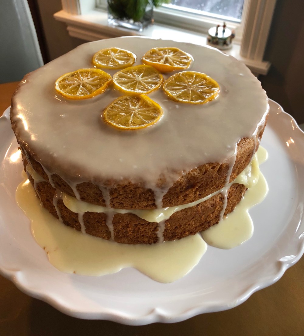 Bake 350 degrees F for approximately 35 mins in two 9 inch pans. Cool and then fill with curd and top with the glaze.